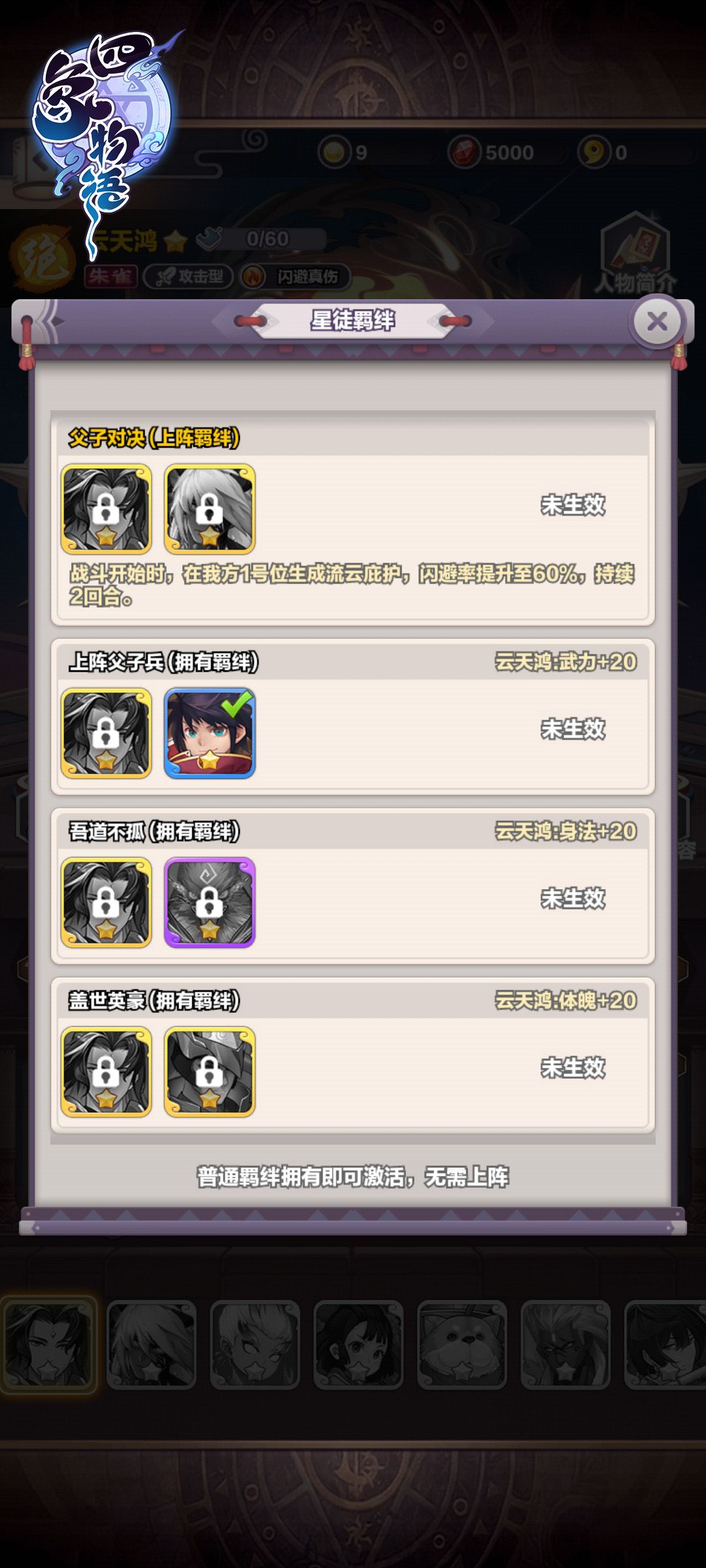 【云天鸿】的羁绊技能,能让1号位的星徒在战斗开始时闪避率提升至60%,持续2回合;