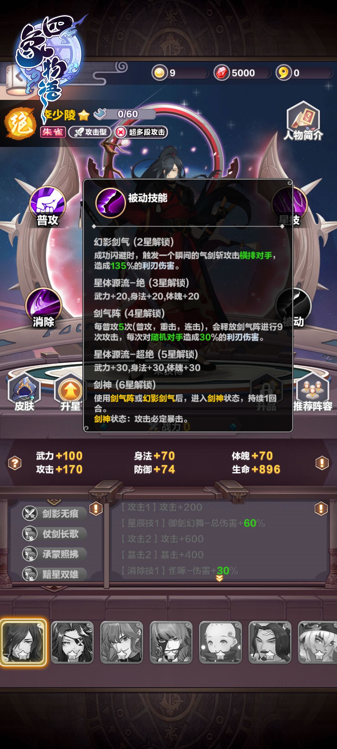 而【李少陵】被动技能(2星解锁),能在触发闪避时发出气剑斩击,对横排敌人造成利刃伤害;同时【李少陵】6星后,每5次攻击或者触发闪避后,能进入“剑神”状态,攻击必暴击,持续一回合。所以,闪避和消除技中的“连击”都能让【李少陵】收益颇大。