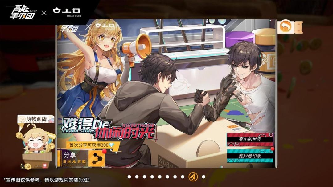 难得的休闲时光,不妨与另一个自己一决高下吧!收藏家们通过游戏内分享功能将《高能手办团》×《甜蜜家园》联动开启的消息首次分享到社交平台,就可获钻石奖励。这么精彩的对决,千万不要忘记分享哦。