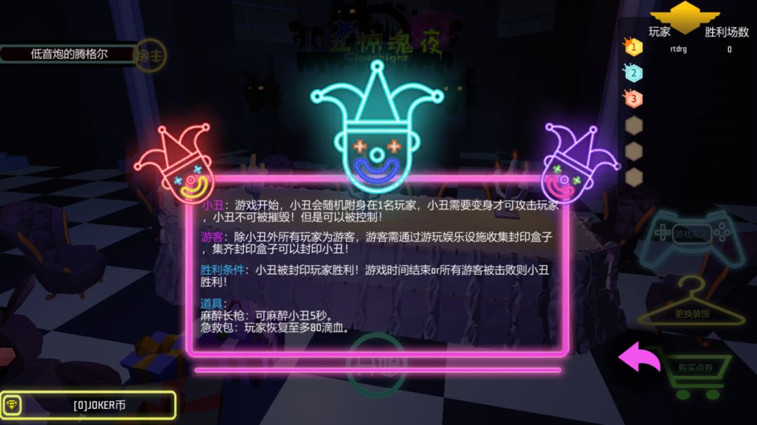 小丑惊魂夜融合了多种游戏元素,玩法简单易懂好上手,扮演小丑的玩家要竭尽全力阻止其他游客收集封印盒子,到了夜晚可以变身为小丑对游客展开攻击!