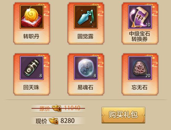 转职大礼包内含1个转职丹、1个圆觉露、8个回天珠、8个易魂石、20个忘无石,共约5820绑元的物品限时3990出售,可省1830绑元。