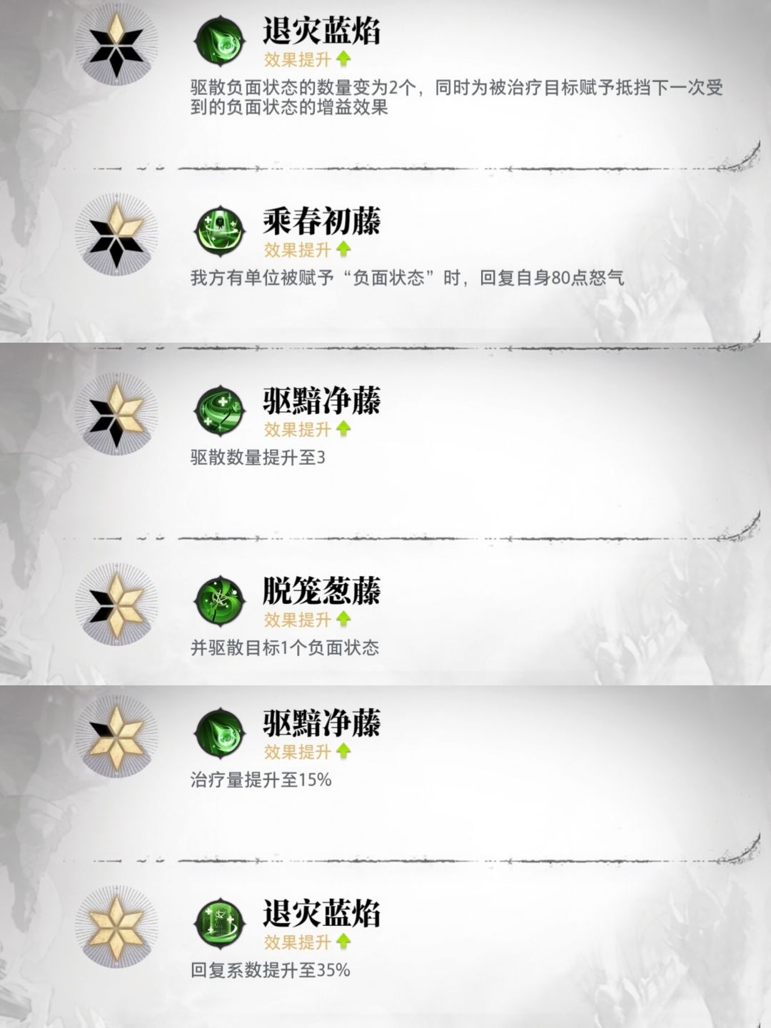 零解语层数下,登场技按自身25%生命值治疗范围内队友,同时驱散我方的的一个负面状态,被动为免控,必杀技则为按自身生命值12%的治疗全体和一个驱散负面状态。每10s治疗生命比例最低的单个队友8%。