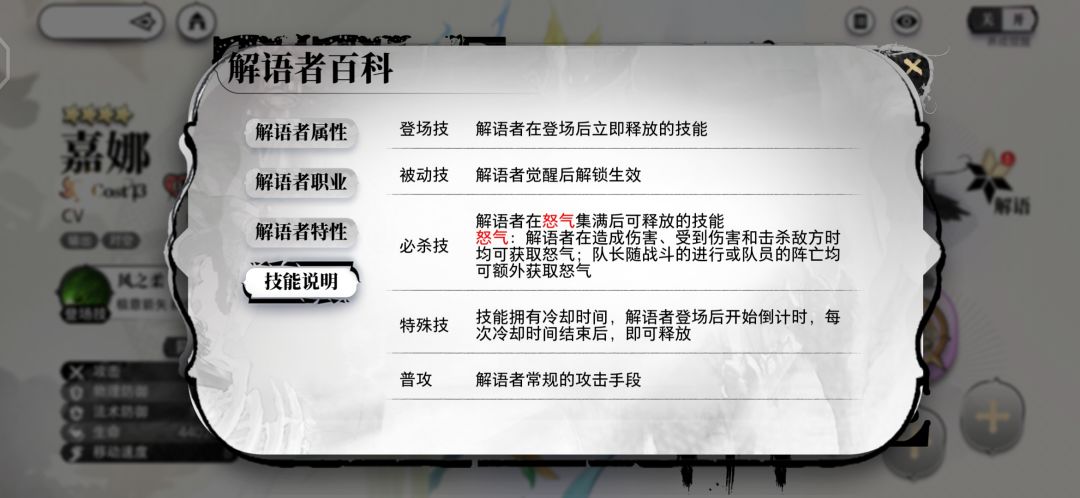 他们所具有5种技能:登场技、被动技、必杀技、特殊技、和普攻,其中,被动技需要我们通过获取资源后觉醒可解锁,必杀技则为角色在战斗过程中通过怒气积满才可释放。 并且解语者们含有6层不同的解语层数,对应增强不同的技能(普攻除外),可搭配不同的载语器、符文(22级解锁)。
