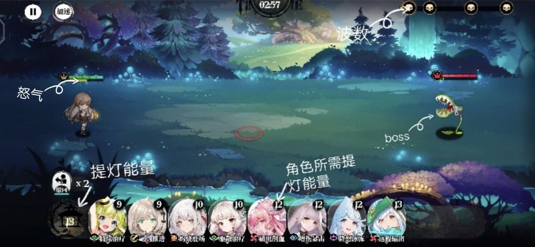 首先,我们战斗画面的右上角是显示野怪波数,提灯能量初始默认为10,当满足伙伴头像右上角的能量时便可召唤了。拖动召唤会以极慢速战斗,所以不用担心手速问题,当队长的怒气(血条下面的小黄条)满了队长便可以释放0提灯能量的必杀技了。撤回只能有2次,撤回后重新上场便又可以释放角色登场技能,但召唤的时间需要满足角色所需要的提灯能量,即需要多少提灯能量就要冷却多少秒,而角色阵亡则要冷却30s。