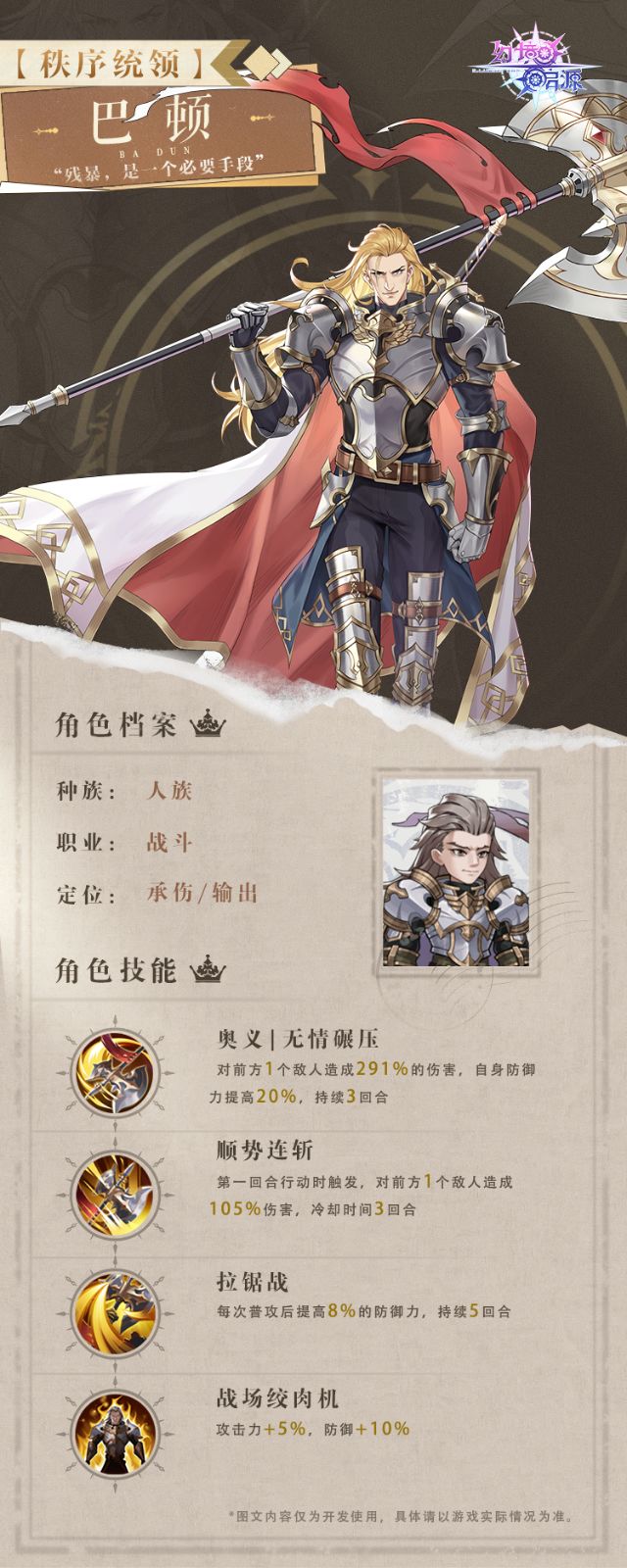 施放大招时,巴顿挥舞巨斧,对敌方造成大量伤害,并进一步提升自己的防御能力。能扛能打,敌方难以攻破。秩序统领,威震四方。