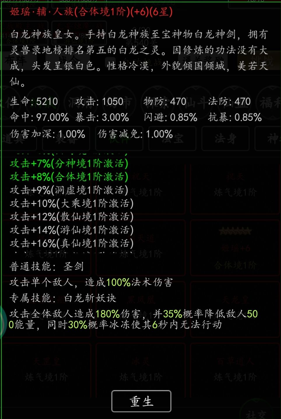 那么我们的伙伴是否需要全部升很高的境界呢?当然是不需要的,通常伙伴的修为会低主角一个大境界,而且伙伴的修为是不能超过主角的,同时,他们的境界到合体期就不需要再升了。而且装备的强化等级上限也是随着主角境界的提升而提升。另外,如果你不小心把资源给了一个不太强力的伙伴,没关系,可以把这个伙伴在纳戒中重生,资源百分百返还哦~