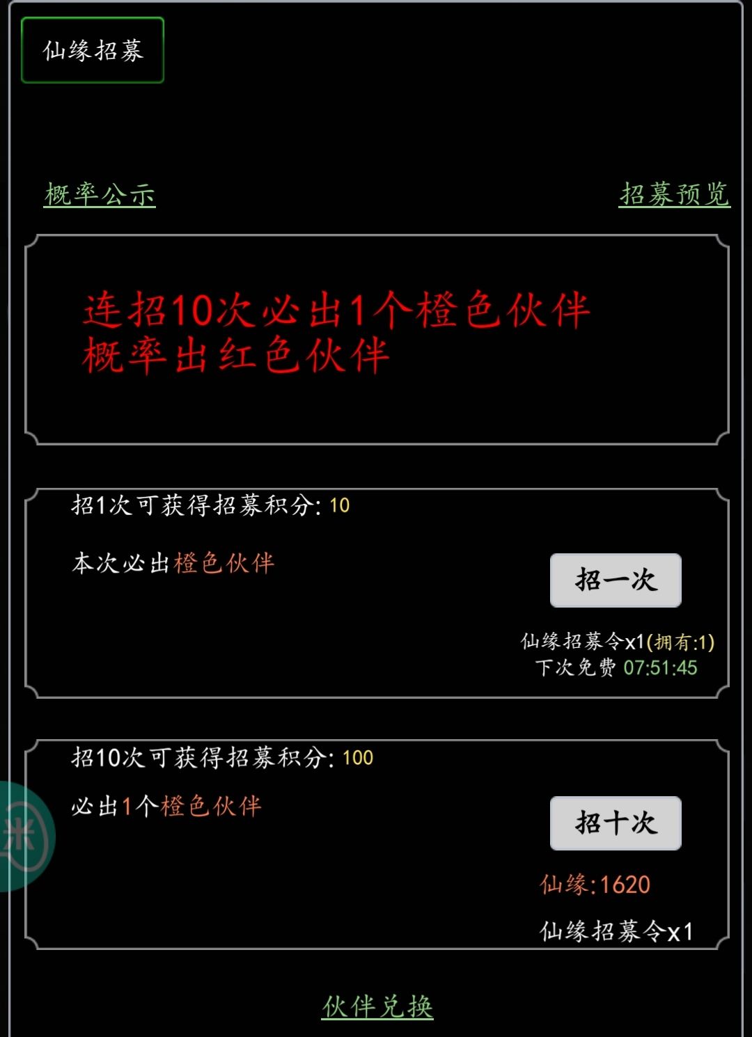 首先,我们过的伙伴的方式通常有三种:第一就是在通关奖励中直接过去角色或者橙色,红色伙伴召唤卡。第二种就是通过招募,花费仙缘抽奖获得(抽奖会获得相应的积分,可以在积分商城兑换更加强力的伙伴),第三种就是通过累计充值,充值返利等活动获得。对于新手来说,我们前期可以通过积攒仙缘来进行十连招募(请各位上仙保存好自己的十连招募截图哟