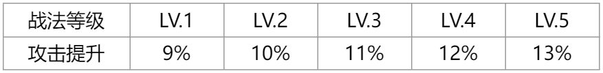 自身血量低于50%时,立即回复200/266/333/400点无双值,同时攻击力提升10%/13%/16%/20%,持续10秒,冷却时间30秒。