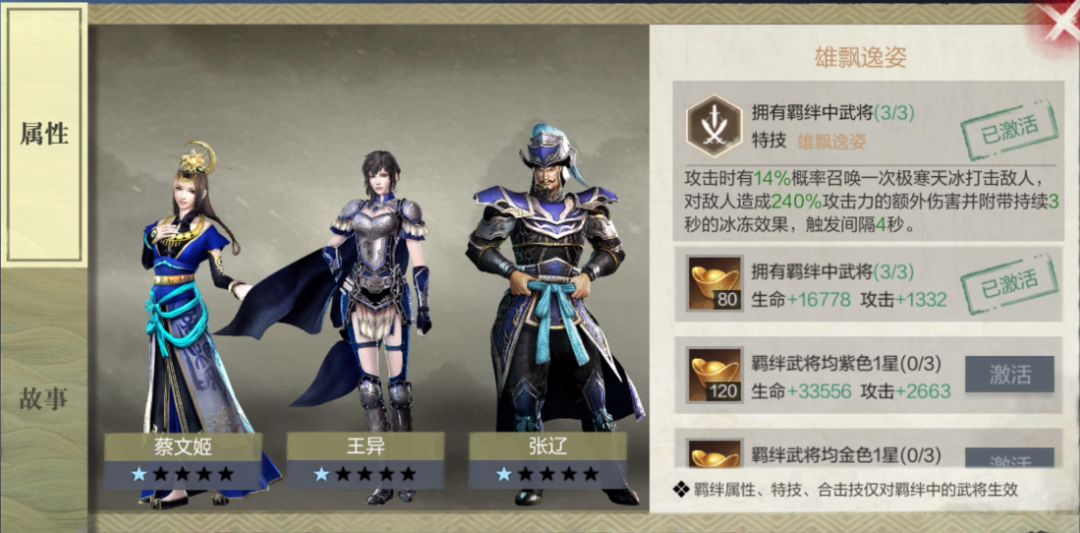 【雄飘逸姿】是蔡文姬、张辽与王异的特殊羁绊,能解锁强力的攻击特技,在攻击时有概率召唤极寒天冰,触发额外伤害与冰冻效果,进一步提高蔡文姬的控制与输出能力。