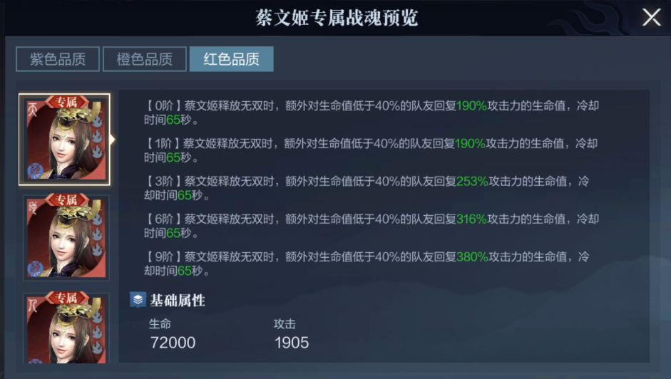 在拥有【天魂】之后,蔡文姬释放无双技能时,在原有百分比的恢复基础上,残血队友将会额外回复极高攻击力百分比的生命值,对残血队友保护能力大幅提升。