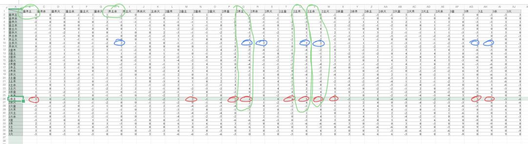 这表格包含了游戏内所有五行组合,而且里面有一些数字(系数)。我下面就来说一下这个表格怎么看。