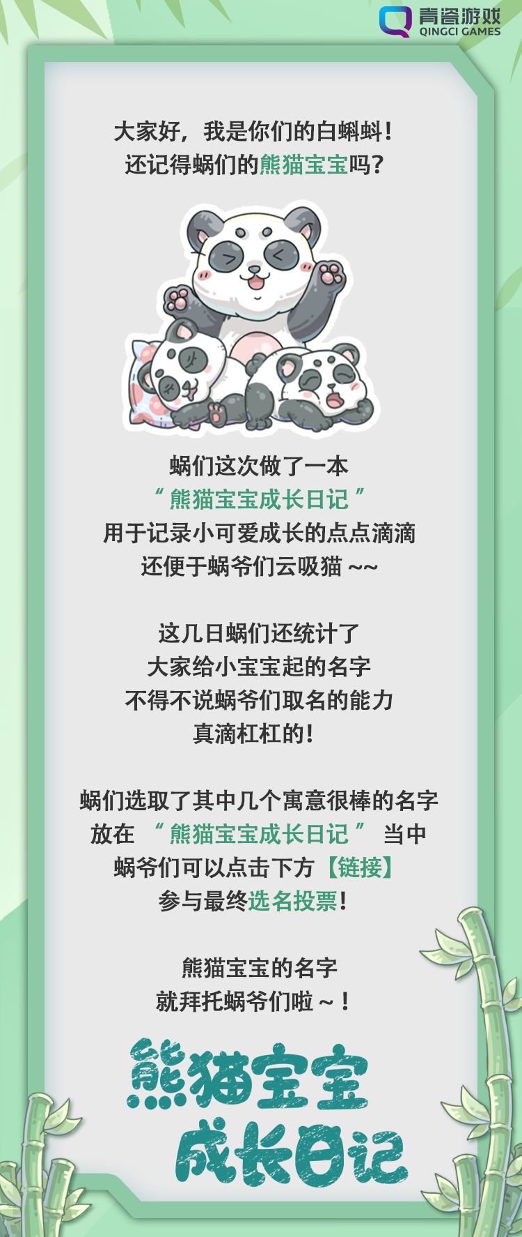 打开“熊猫宝宝成长日记”参与最终选名投票吧~