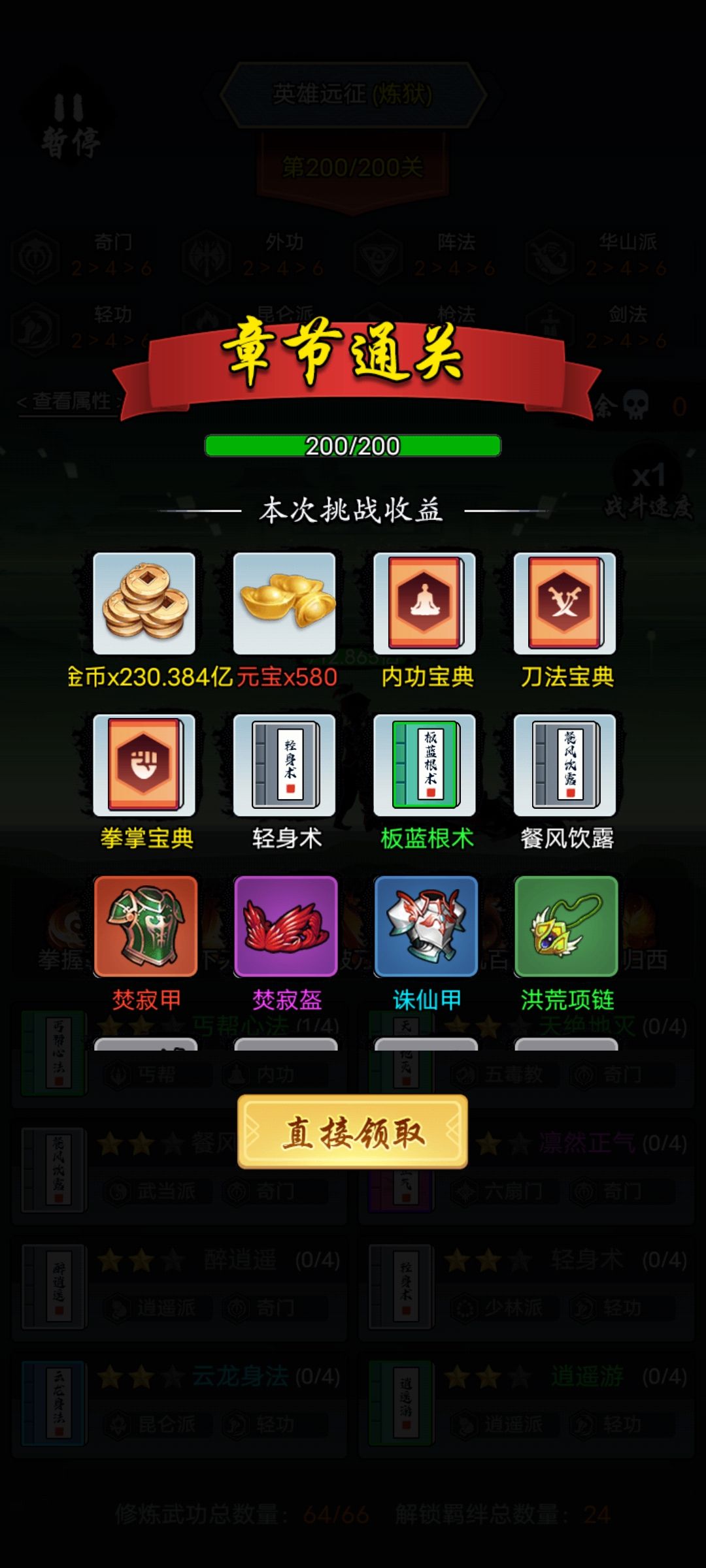 先20启动太极。后面凑6剑4全真4奇门6逍遥6拳6六扇。再慢慢补全6奇门6华山6昆仑6外功等等等等。一直可以太极无脑锤到64关,把所有64本秘籍都拿完。接着就是开始2级金刚,2级太清刚气,2级玉女,2级观天,2级所有内功心法,求稳的话,早点拉乾坤3星。我自己是一直卡到99关,中间还加了一些比如清心,喝水,金钟罩,段体等2星,最后才拉的乾坤3星。100关以后,乾坤三星完了,你再看看你缺啥,缺啥就补啥。尽量在140关前把免伤补到130%(是120?还是130?有点记不住了)以上。反正免伤吃满就是了。后面就是随便打的垃圾时间了。