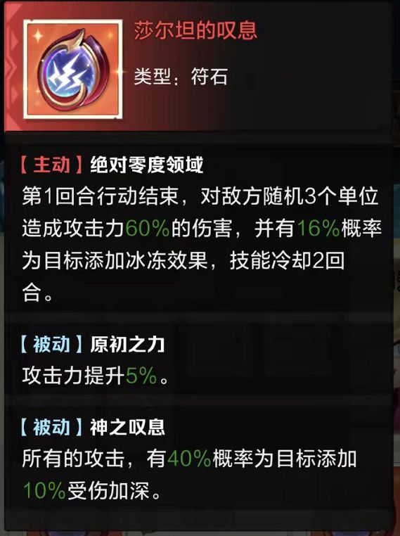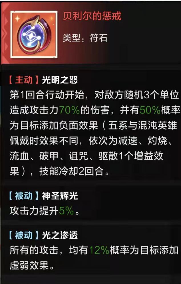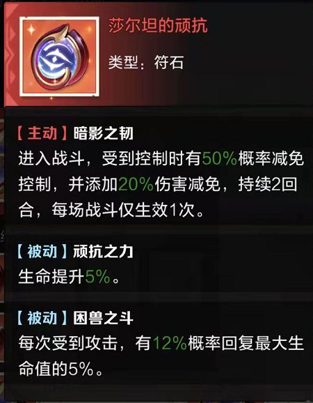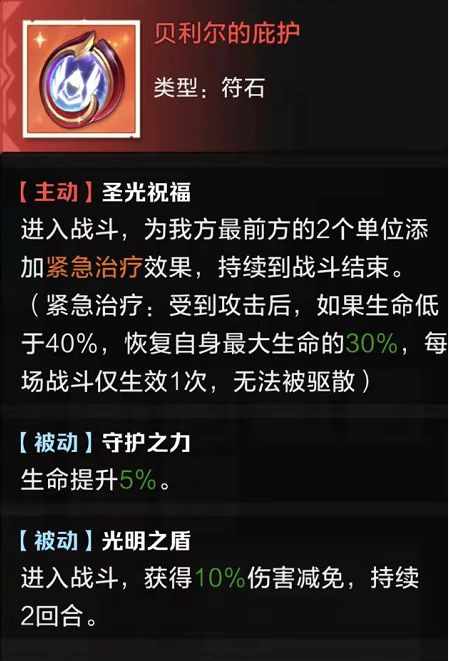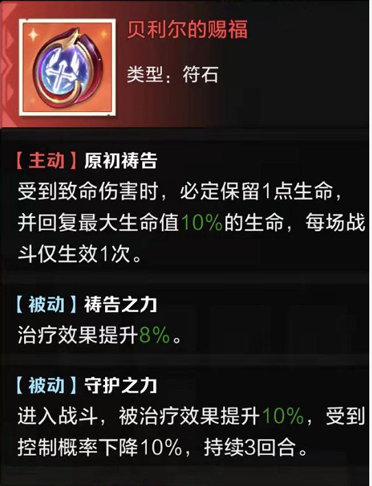 生存类符石,推荐第二个做给奶妈或黑骑,很多时候免死一次能恶心到暗刺光刺这些需要击杀才能启动的英雄,保证存活能力,而且被动降低被控几率、治疗加成、受治疗加成都很契合。