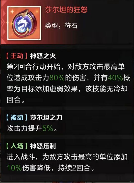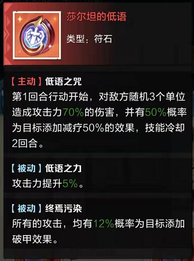 我以前最爱用的符石,跟新娘非常的搭,入场就上debuff定向打对面主c,偷奶无法清除基本上活不了,就算没杀掉也极大的限制对面主c的发挥,理想情况下第四回合就能减少55%的输出。后来出了圣女给主c免疫狂怒的作用就大打折扣了。