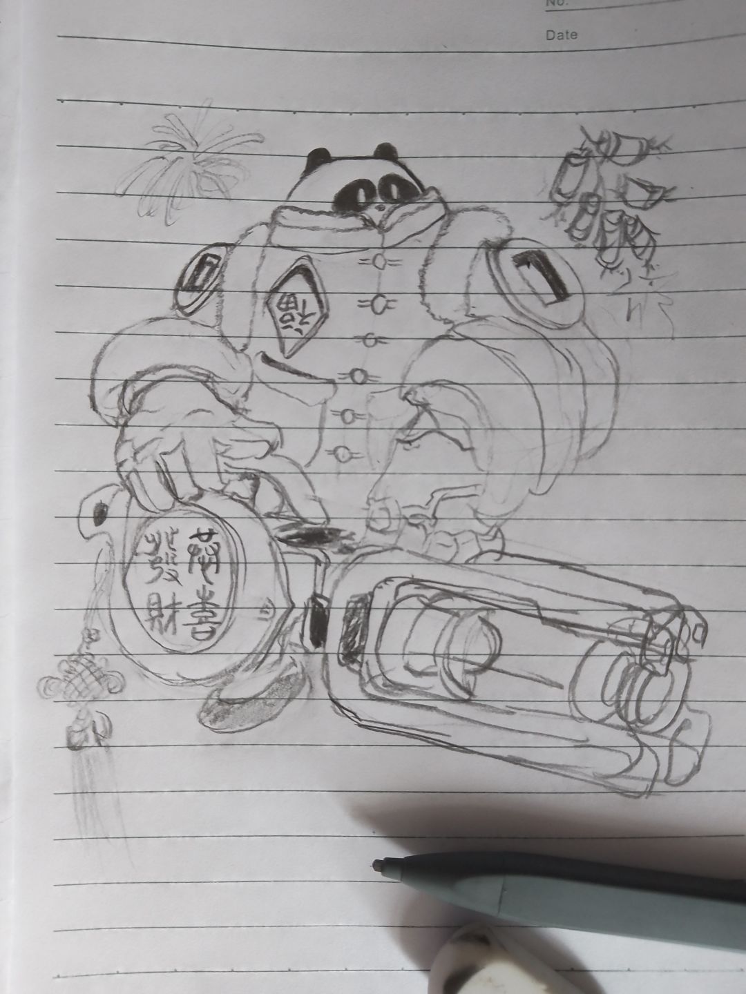 枪上的字是“恭喜发财”的篆书,写得匆忙有笔误…