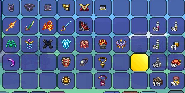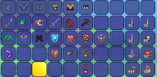 饰品:仙灵翅膀(肉初翅膀)水陆两用靴、绿马蹄气球(白马蹄气球)克苏鲁护盾、黑曜石盾、混乱之脑(蠕虫围巾)十字项链(星星面纱)/狂战士手套(强力手套、悠悠球袋)