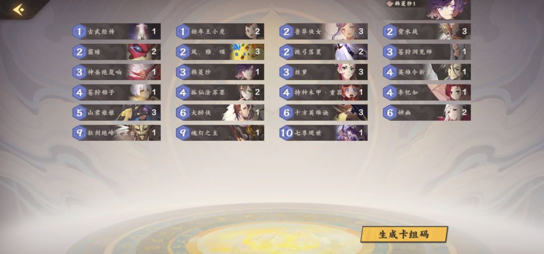 这套是我打的最舒服的,一费buff可以帮助走位,也可以重复利用。给小虎黄鸟🐤侠女加buff,抗阴和火的前期伤害,也可以防止丝萝什么的乱炸,把自己怪早早炸死。小虎背水战,经典模式,一脚十血踹死对面。侠女清场神卡,放对位置3-3斩星苍蝇都能秒杀。落星可以破魔免,寻仙3加清场,对前期场面优势也有很大帮助。洞见师背锅卡,保自己核心怪,抗对面大雷大爪子。韩菱纱,补充前期强度,配合背水战,补前期牌。霸瞳和小红袂,换掉对面的大怪。狐仙,优质回血。红木甲,清场加补直伤。山君娘娘,加buff以后,配合满丝萝婵幽,可以瞬间打出18点伤害。伤害结算顺序靠前,非常厉害。大醉侠,配合侠女丝萝,可以上演医学奇迹,丝血回满不是梦。婵幽,核心卡,黄鸟补牌,丝萝清场。十方补牌,核心卡,这套牌消耗太多。如果补不上牌,前期优势再大,对面都可以通过后期卡,把优势打回来。百里云魂灯,斩杀卡,七尊,后期强卡。这三张,注意别被偷。