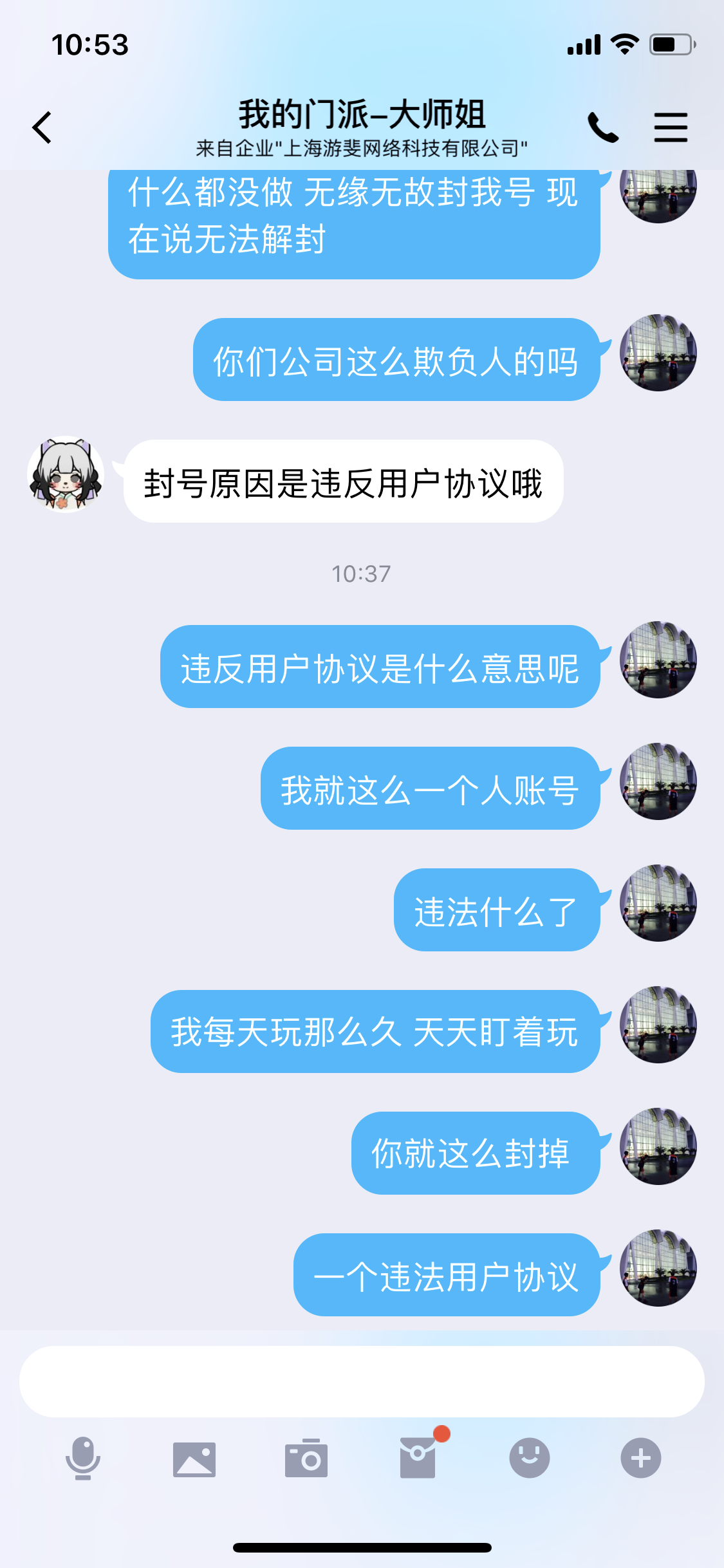 现在雨落丹墟的账号无故被封,官方一个说法没有,我去找QQ大师姐投诉,复查完说我违反用户协议无法解封,我一天游戏时长很长两个号不停来回切换玩,从来没有线下交易过,也没有用过什么软件脚本,一分耕耘 一分收获的搬砖凑仙晶与材料。