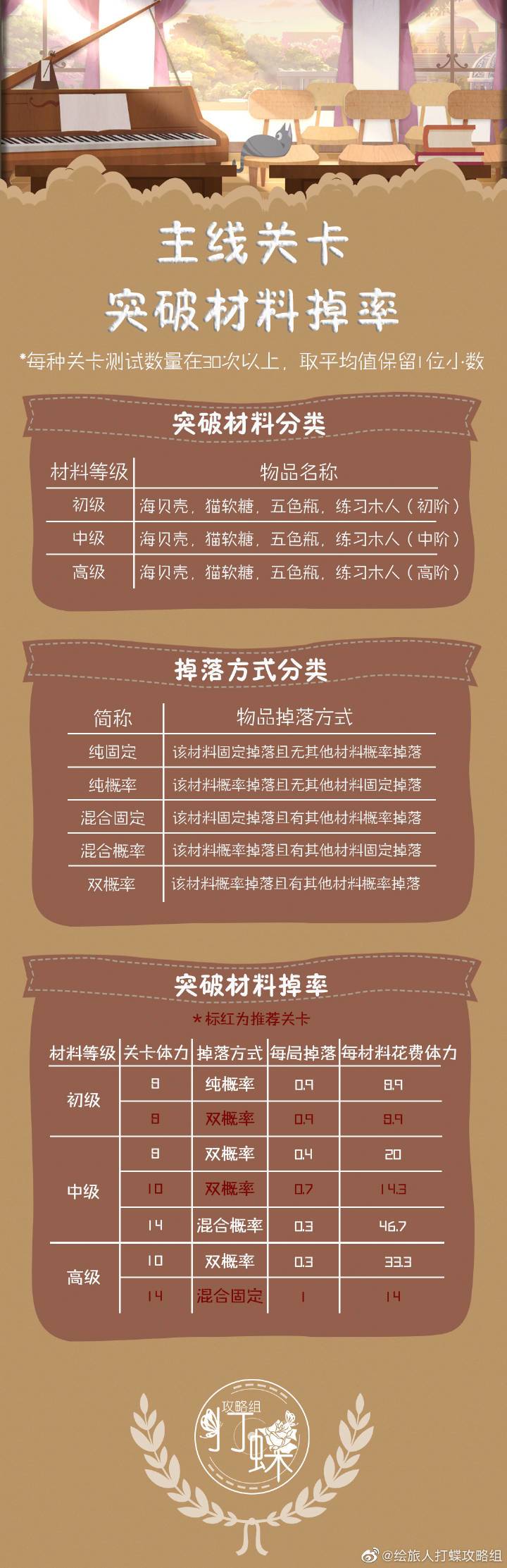 入坑十几天的萌新,半个强度党+叶推。喜欢照着攻略玩游戏,避免走弯路。跑到微博扒拉了一些攻略,基本来自一个名叫打蝶攻略组的博主,虽然这个攻略组已经解散,但还是说明一下。