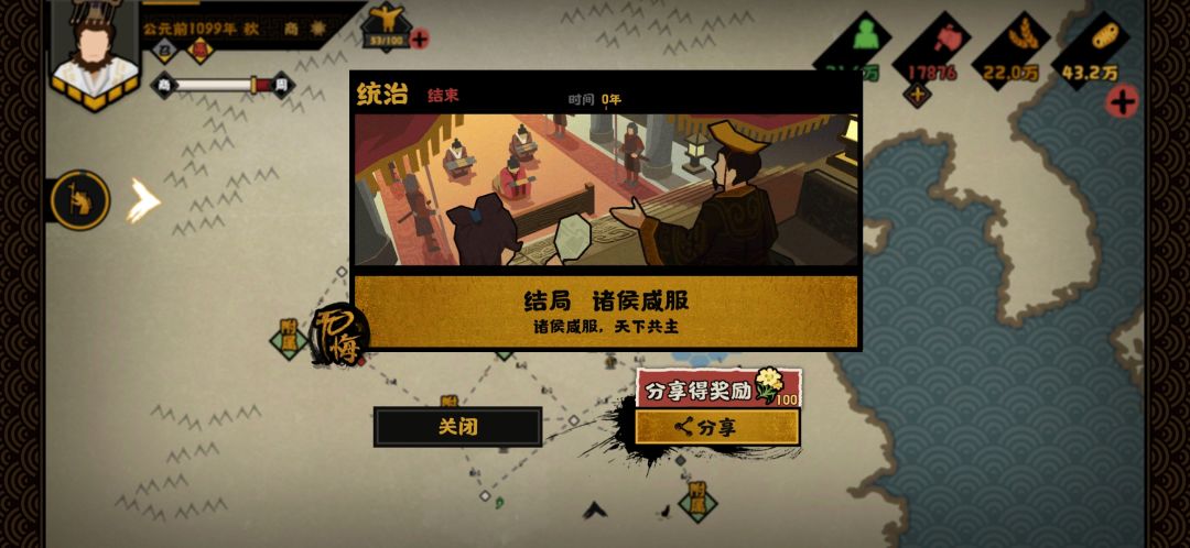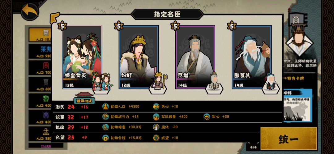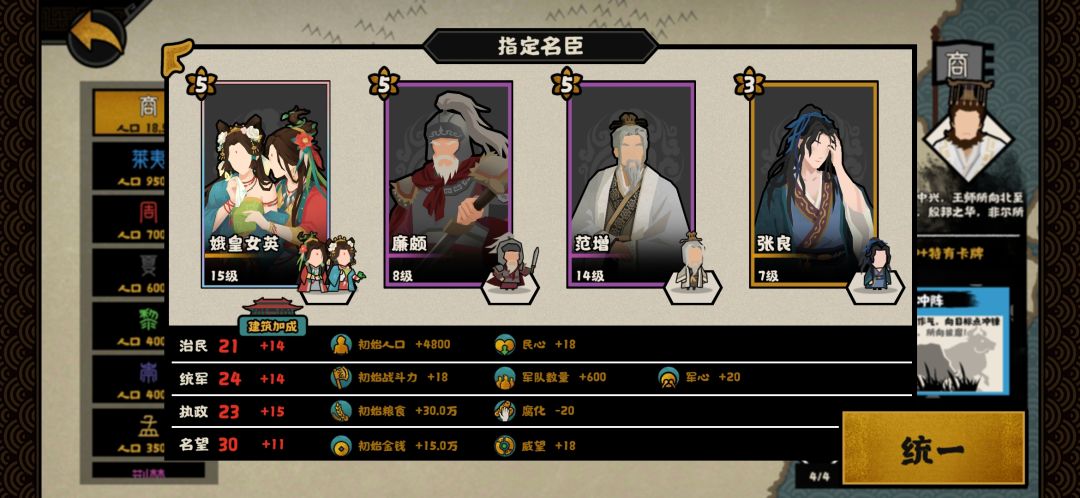 1.选择国家“商”,携带名臣(任意一套都可以)