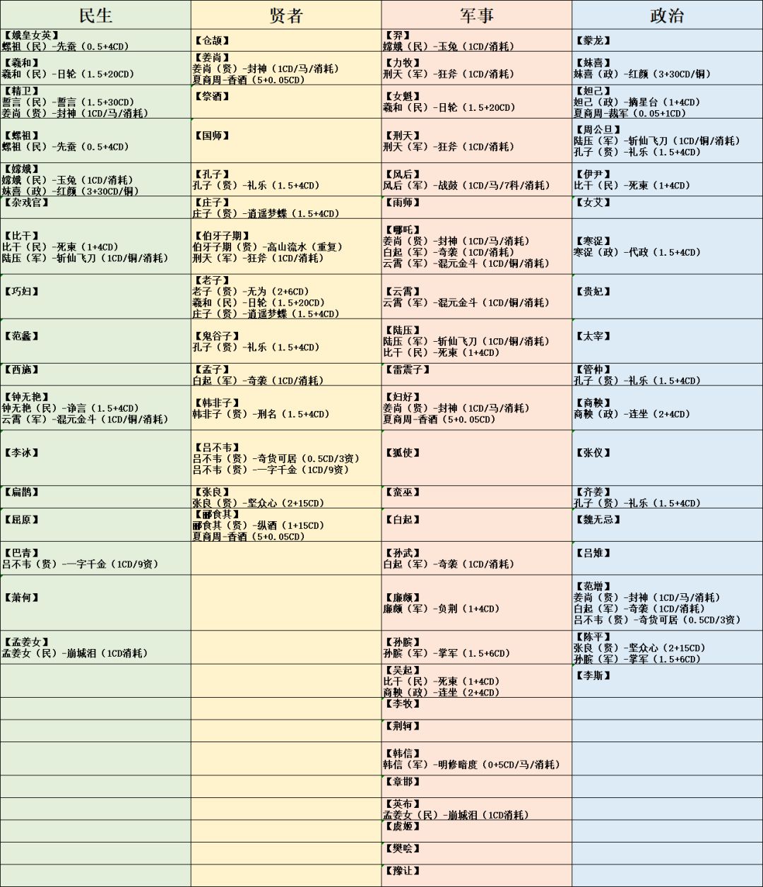 军事:廉颇(辅助)(当然也可以用孙武,白起依靠战斗来获取威望,从而获得威望)