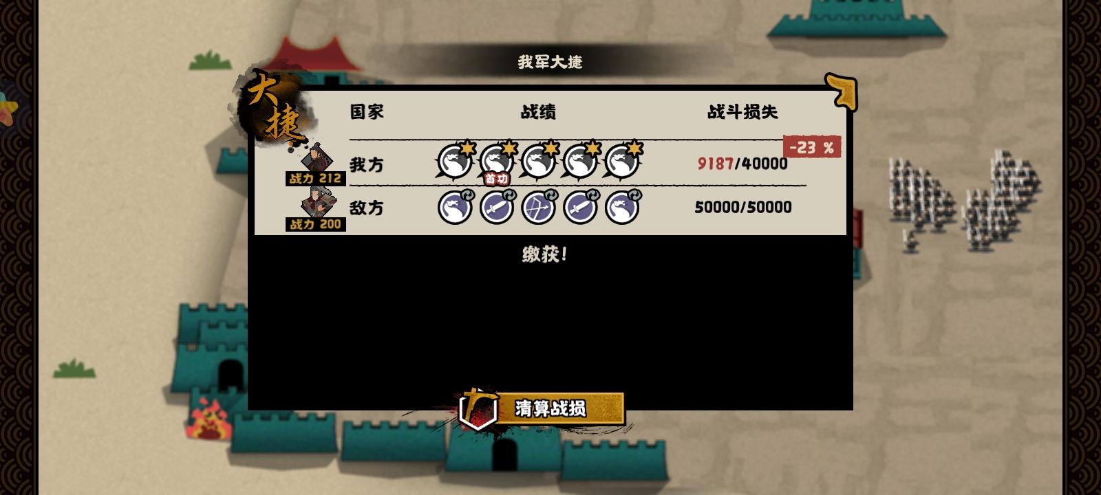 最后胜利的截图。可以看到,光狼城给的秦军锐士卡我都没用。