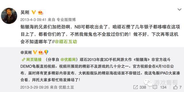 吴刚的野心太大了。以《骷髅海》为例,2013年3月,吴刚就已在微博上宣布将推出一款体现顽石制作实力的网游,其制作人为《契约OL》的制作人盛炯。顽石互动官方微博曝光出的美术设定也十分惊艳,令许多玩家翘首以待: