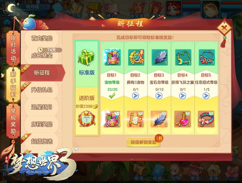 开启昕征程后,完成指定任务目标即可领取奖励。解锁进阶版昕征程还可领取绝品宝图、双技能龙角护符等超值奖励!