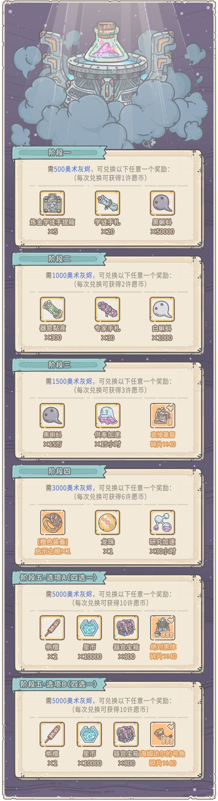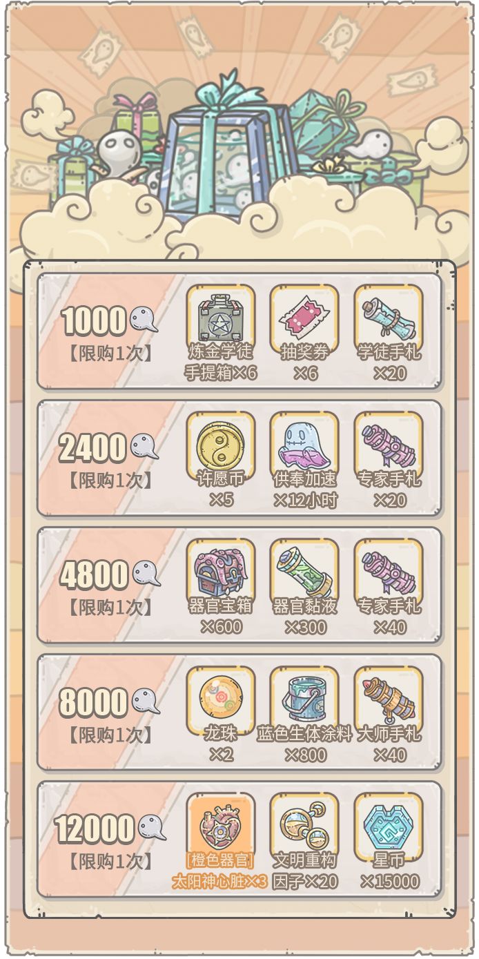 活动期间,贩售机将出现福利礼包,每天5点刷新,售价1白蝌蚪。内容为:白蝌蚪×20、许愿币×1、奥术灰烬×100