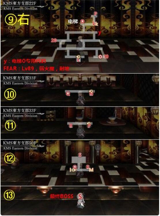 地图:8张流程:分为2队:阿鲁多队(左),艾米队(右)。左h→右i→左通(16处)右通,把猫换到左→左K右L→左j右k→左N右P→左vs苦难地藏×2(弱斩突以外,耐斩突,反击斩突,斩突攻击时回复HP10w,倒计时为0时全体MP全扣除),右vs劫难地藏×2(同左,把斩突改为打魔)→左Q右R→左I右M→S→最终BOSS宝箱:13~20,其中18是能力(力智速)减益耐性<锤>道中:Lv79FEAR:Lv89,弱火魔,耐地