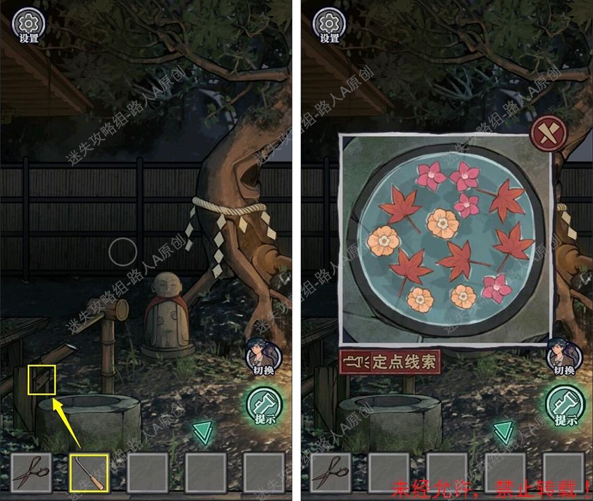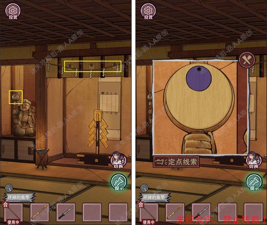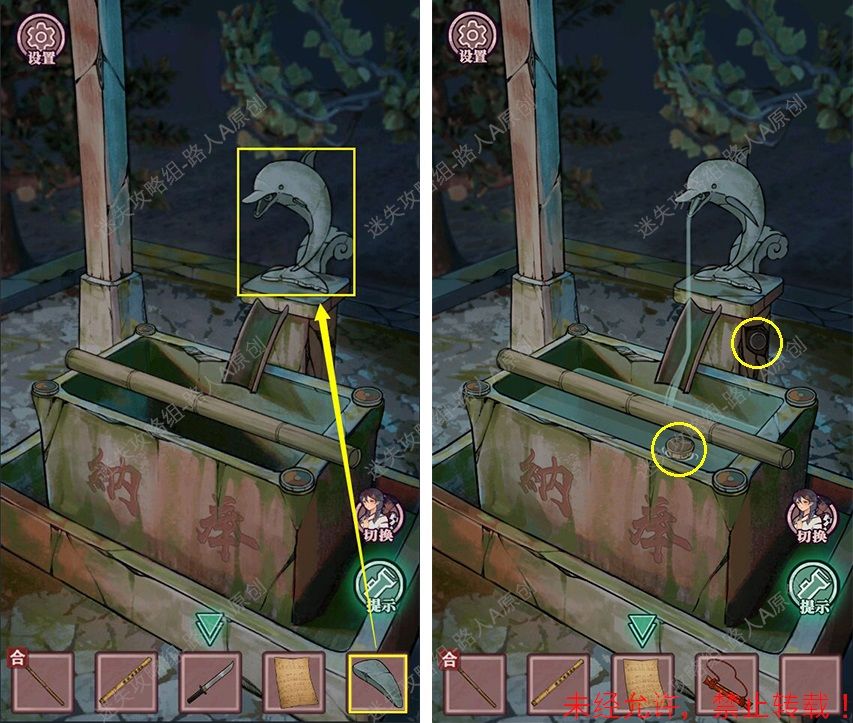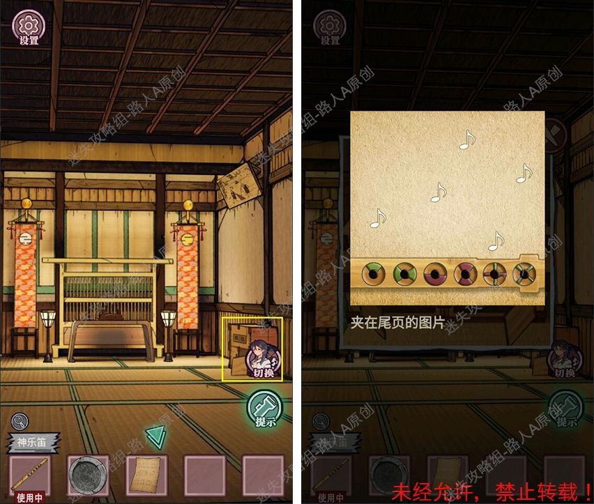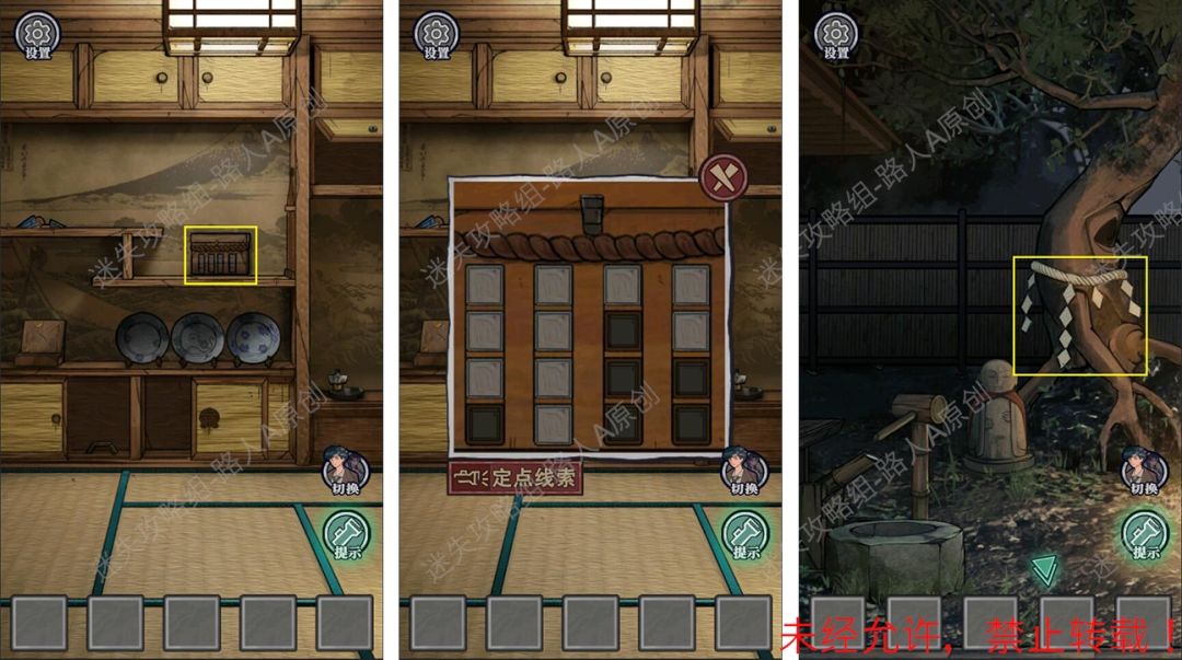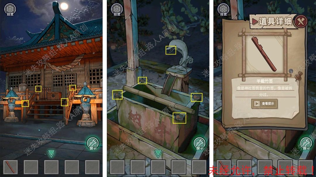 19.查看拜殿的楼梯扶手,调整守水舍的水池机关,得到【半截竹签】。19.1、19.2、19.3