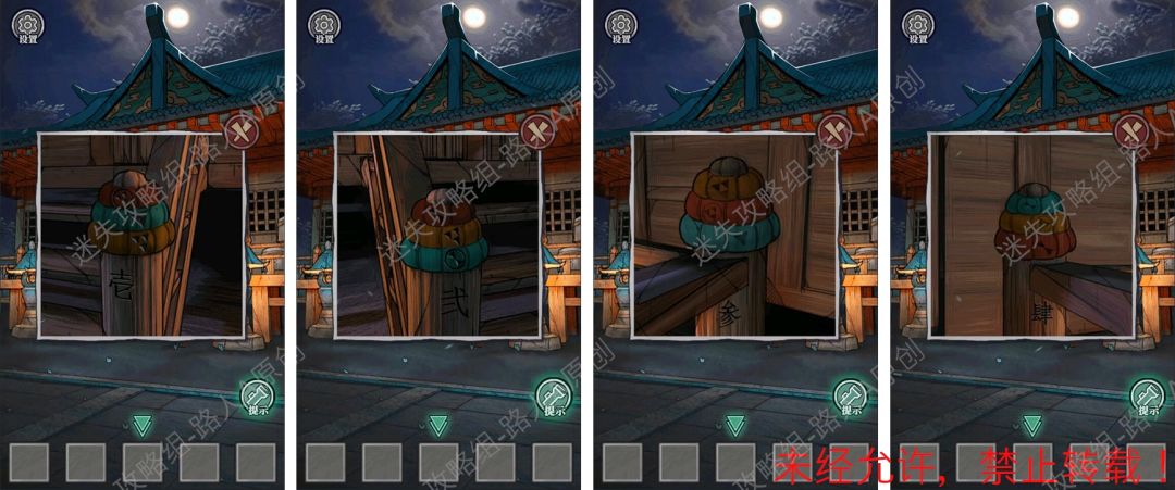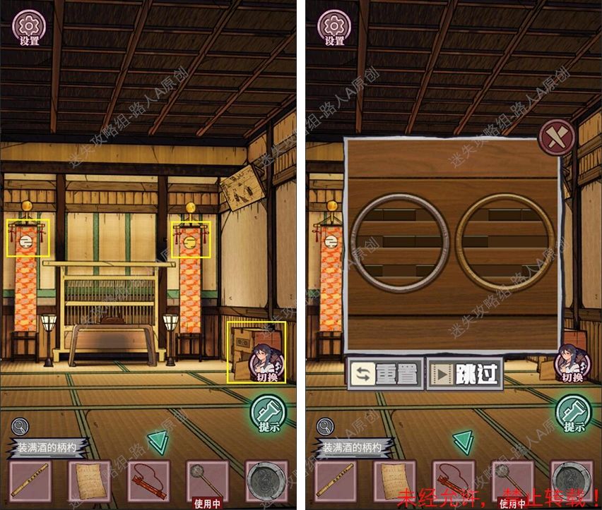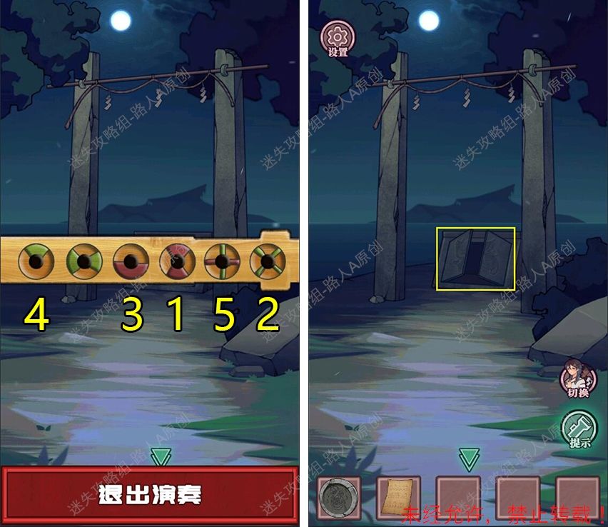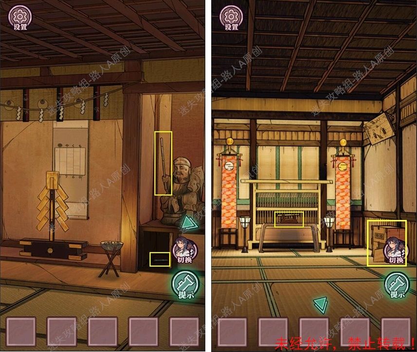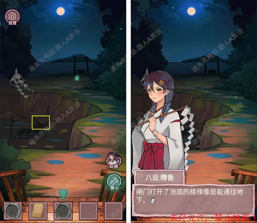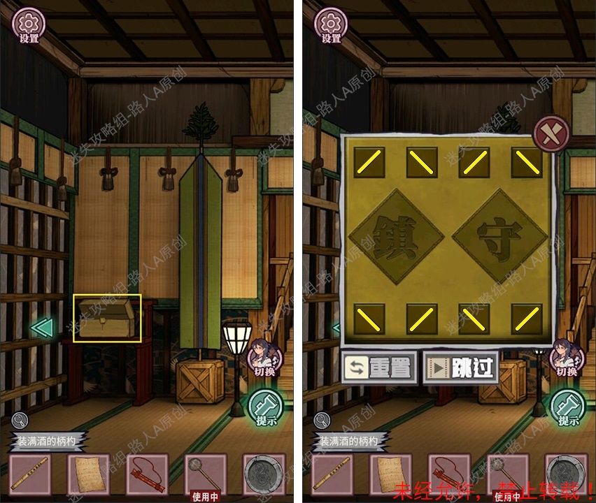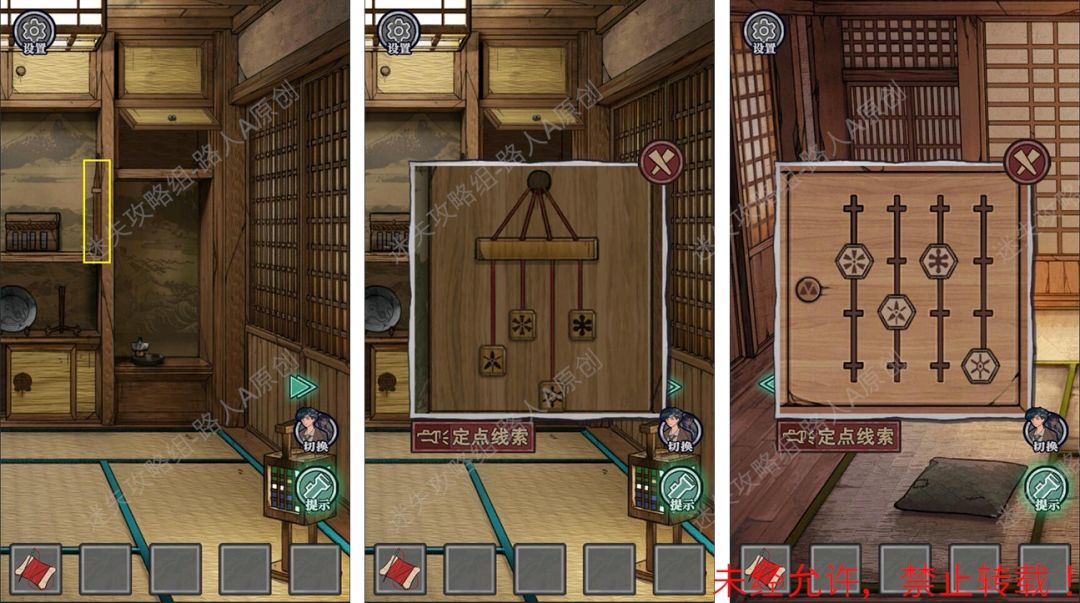 19.查看拜殿的楼梯扶手,调整守水舍的水池机关,得到【半截竹签】。19.1、19.2、19.3