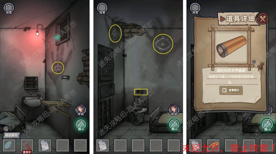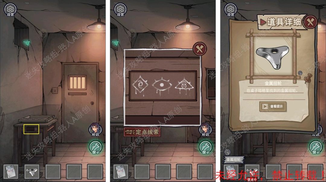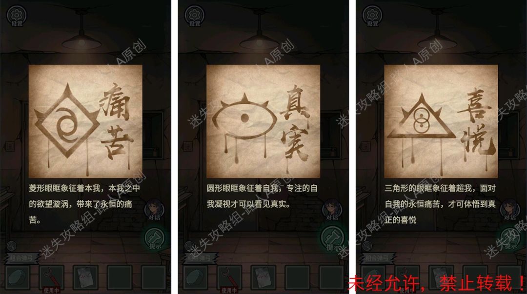 11.根据教团手册的线索,调整墙壁的三眼神图案,得到【圆柱形的光学器具】。(低处的直接点击,高处的用【弹弓】射击。)11.1、11.2
