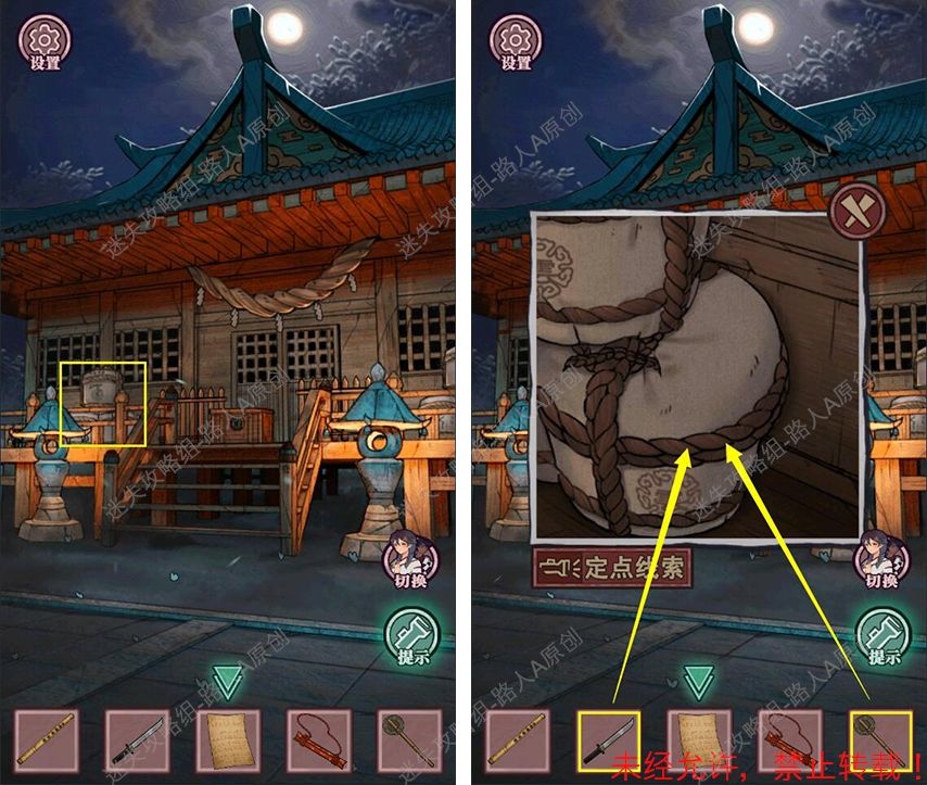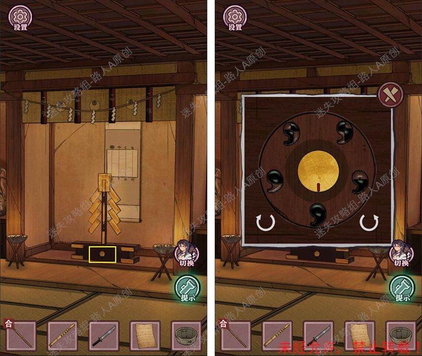 51.根据勾玉的线索,打开御币盒,得到【供奉品·剑】。(从指针朝下的默认位置开始:右、左、左、左。)51.1、51.2