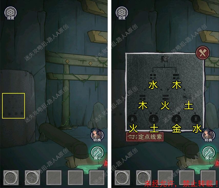 67.结合五行八卦的线索,解开石头机关,走上楼梯。(根据线索正确答案是【火土金水】,但谜题可能有BUG,输入【火土金木】也能解开机关。)67.1、67.2