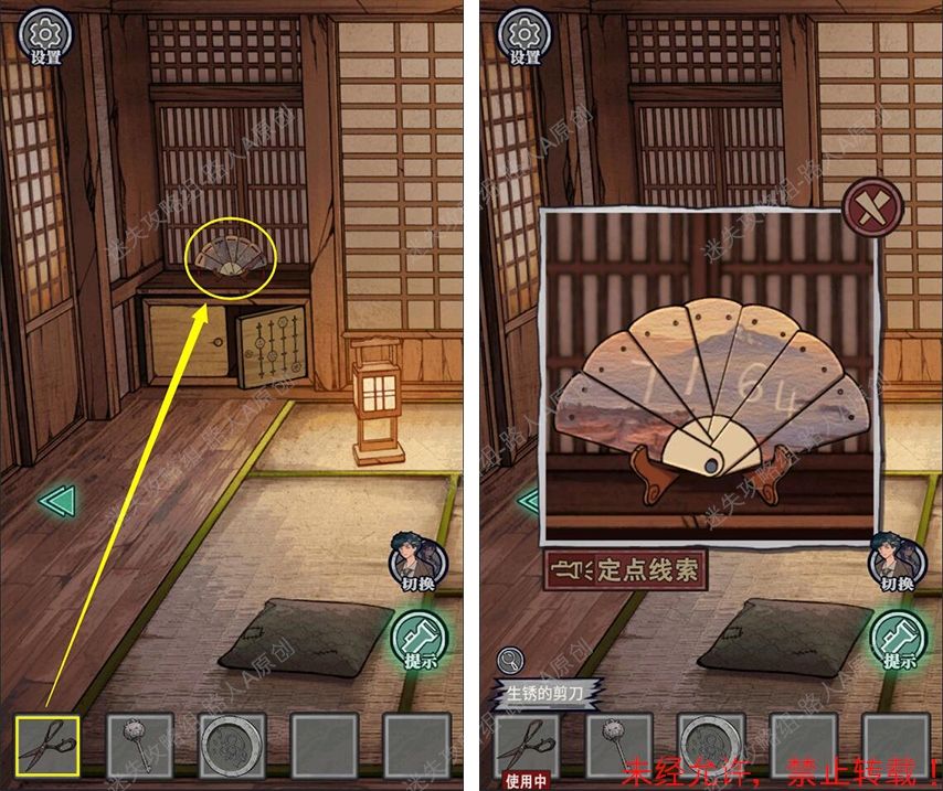 41.用【剪刀】剪开扇子的红绳,调整扇子得到密码【7164】,打开盒子。41.1、41.2