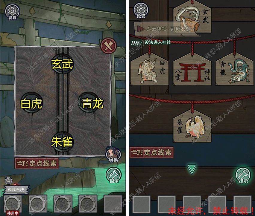 69.将4个石块放入门的凹槽:北玄武、南朱雀、西白虎、东青龙。69.1