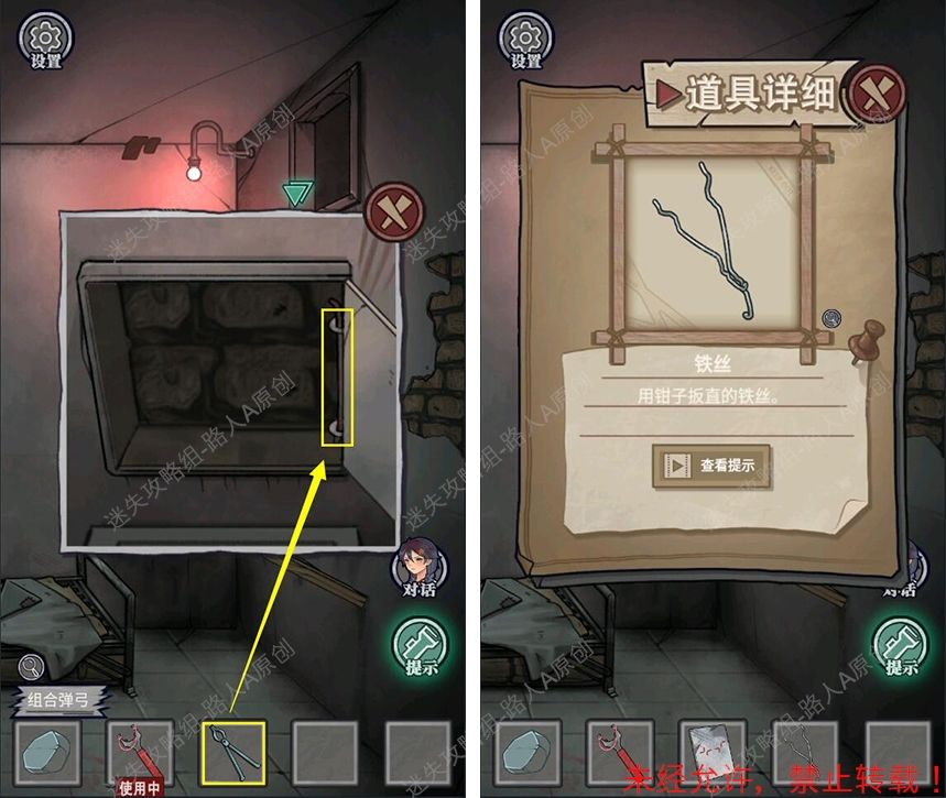 8.用【钳子】拆卸镜子,得到【铁丝】和【玻璃板】。8.1