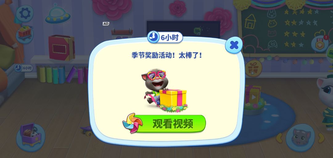季节奖励活动!太棒了!《汤姆猫总动员》游戏里的季节奖励活动,采用转转盘的方式进行,小伙伴们只要观看一次视频,就可以获得一次转转盘的机会。而只要转动转盘,就必定可以获得一次奖励,轻松又简单!当然,能获得什么样的奖励,就看小伙伴们的运气如何了。