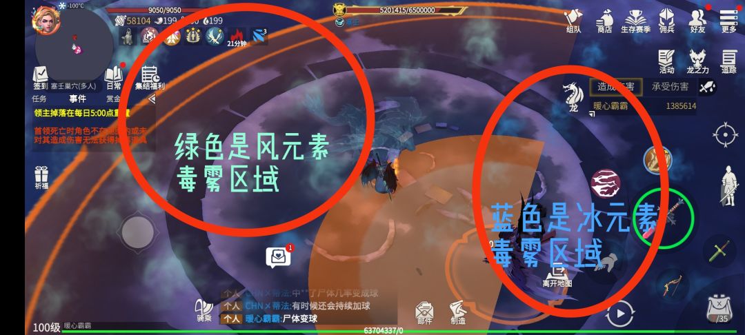绿色区域为风元素毒雾区域,蓝色区域为冰元素毒雾区域。站在蓝色区域将叠加冰元素毒debuff层数,降低风元素毒debuff层数。同理,站在绿色区域将叠加风元素毒debuff层数,降低冰元素毒debuff。毒球出现要立马清除毒球,毒球会加速毒debuff的叠加,叠加到10立马触发秒杀机制。