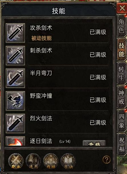 (1) 通用技能包括回城、盟重回城、比奇回城、传送都是默认学习,可以直接使用,提升回城技能等级可以缩短使用CD;安全区回复技能需要达到条件后消耗材料学习提升