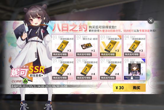 (1)活动期间,指挥官购买「八日之约」即可在活动解锁期间随活动开启天数领取「八日之约」奖励;