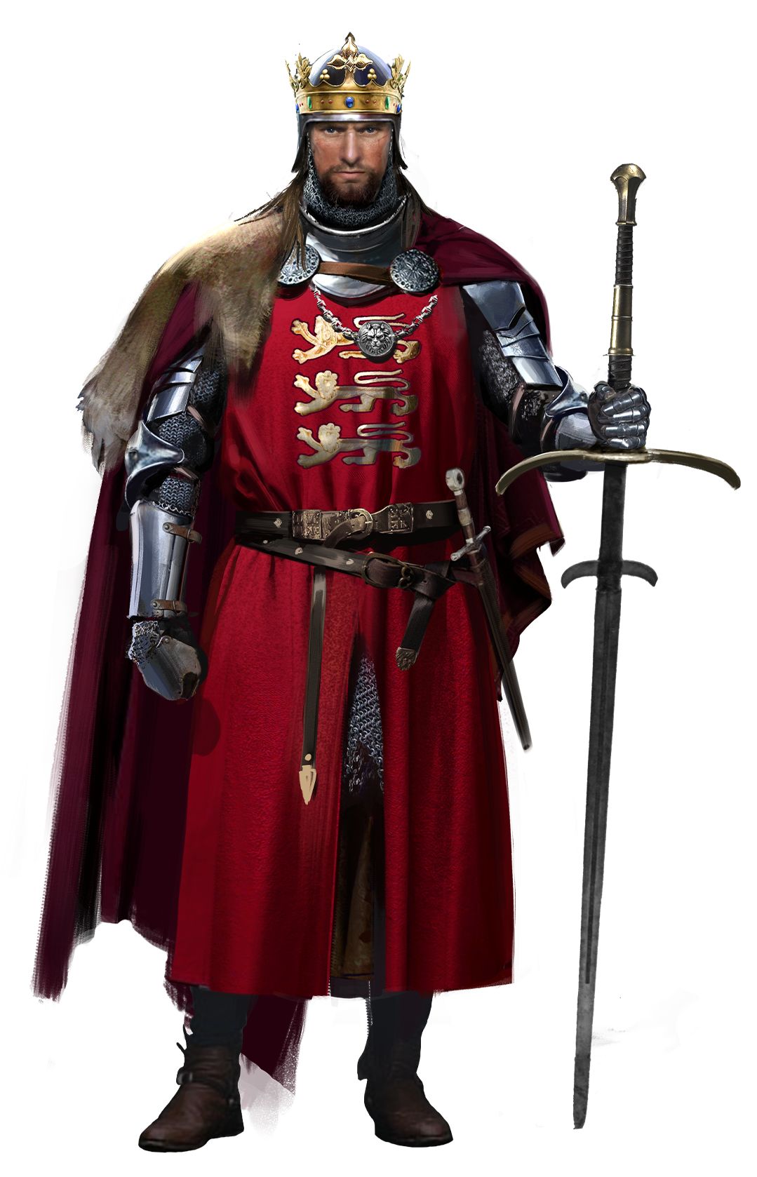 手持无畏铁剑,锃亮铠甲更显体格之雄壮威武,鎏金王冠难掩目光之冷峻凌厉。