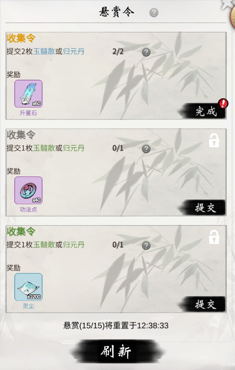 注意储存上限,宗门事务25个,悬赏令15个,如果运气差没刷到可以退而求其次完成几个蓝色任务,以免超出上限!