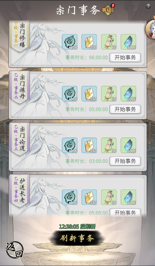 自动刷新出现高品质任务的概率较低,而花费机缘手动刷新至少是蓝色品质的任务,但是一个任务需要花费20机缘才能刷新,五个任务也就是100机缘,对于零氪来说肯定是能省则省,毕竟每天刷事务的机缘多买个福袋不香嘛?