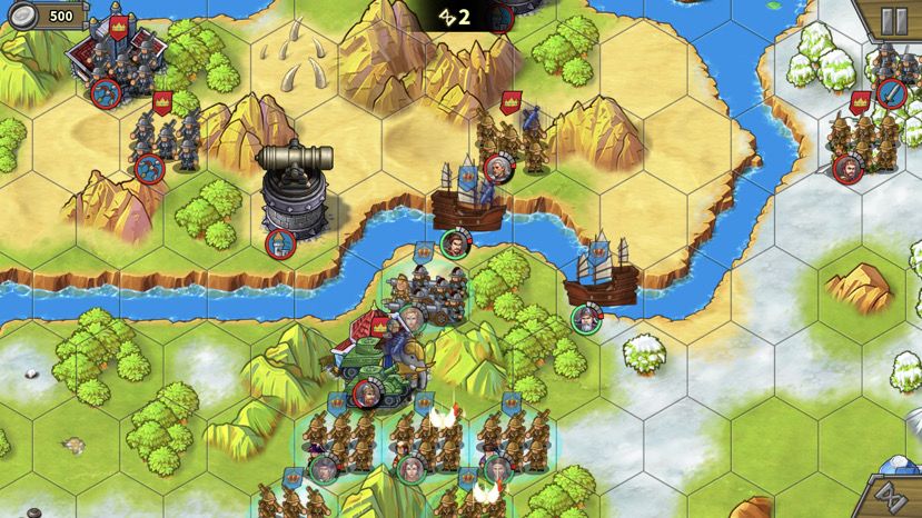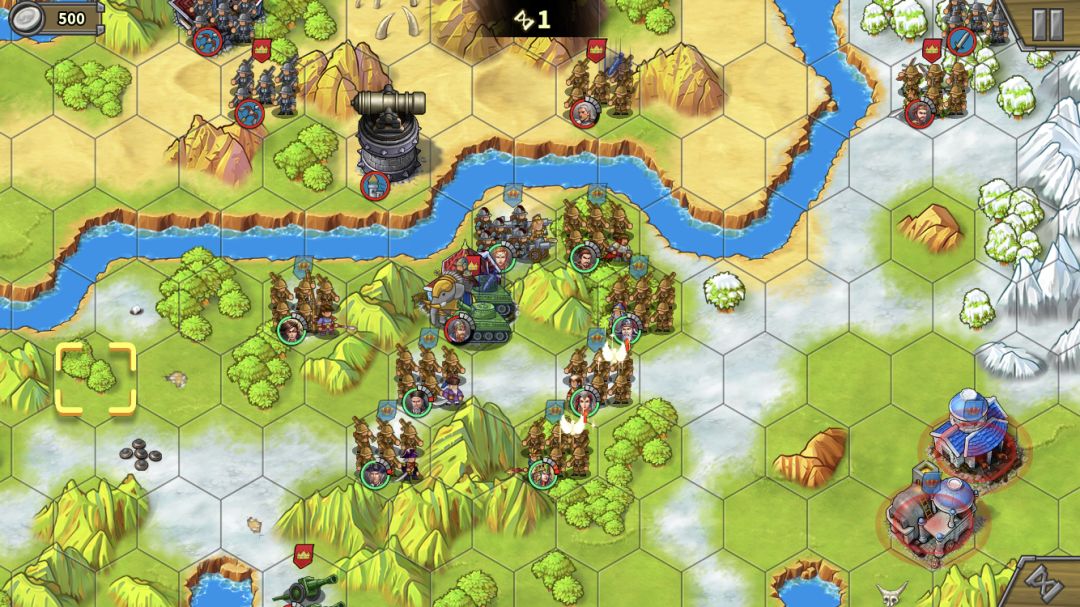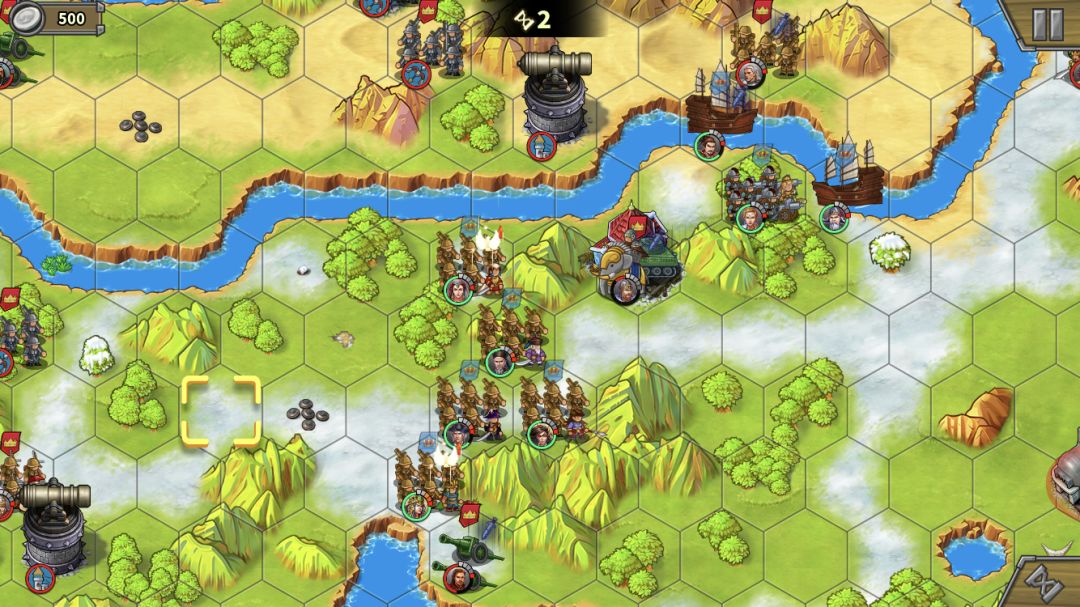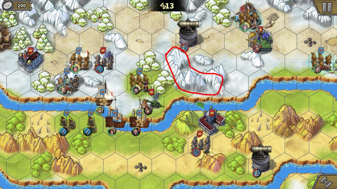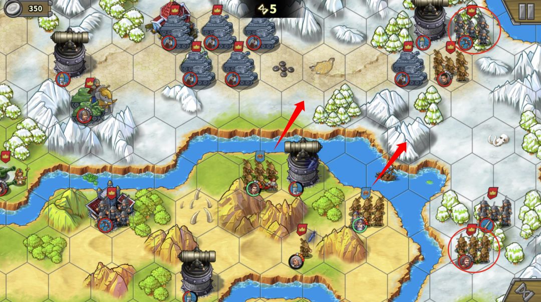 这里有个地形需要强调下,红圈部分是不能站人的。因此,部队在红圈下方河道处是不能登陆的,如果全员走河道会很拥挤,前进缓慢浪费回合数,这也是为什么一定要分2个人走上面的原因。别忘了用我们造的步兵去占岛中间的靶场。