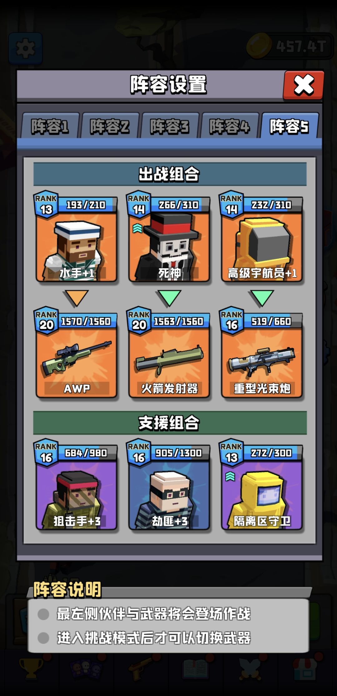 该阵容上三把橙色色武器同时配合宇航员吃到高额的武器伤害加成。水手开场修理以及4技能的高额加伤也是必备的,大狙根据要打的怪物类型不同调整武器位置吃到劫匪伤害加成即可。