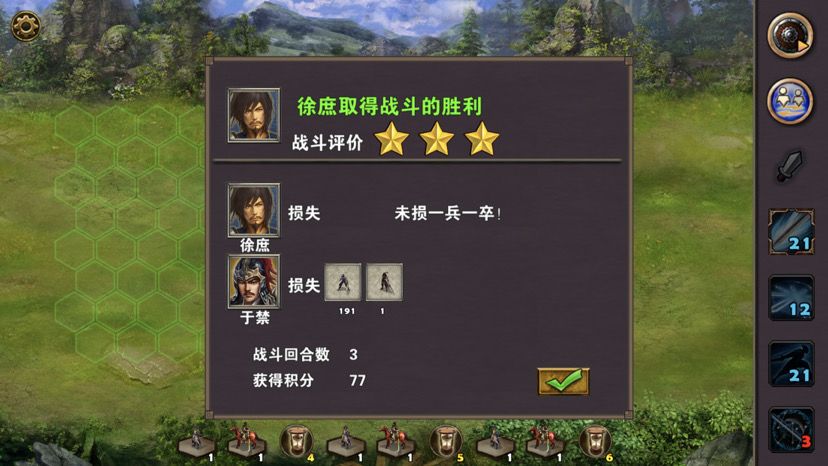 首先查看三星过关条件(3周1天内通关地图,并在挑战过程中获得8次三星战斗评价),开局获得徐庶英雄令(1级),建议返回大厅先去其他图把徐庶升满级再来过关,剧情对话后可以选一个英雄辅佐战斗,有人用刘备,我比较喜欢用关羽,而且提前要备好两套回蓝装备(五蕴方巾两个、鲁班手札四个或者炎雀指环、雷杖或者黄泉、五色剑两个),兵种推荐鹰卫法师,战术卡推荐战前准备、准备就绪,天人合一或者暗噬咒、极意。开局没兵往前走打掉吕旷,往左下走(千万不要打于禁),看见农场前面有个npc对话后可以捡神行果(当然也可以不过来,不影响过关),然后从右边往上打过去,城内建筑发展府邸、靶场、民居、神庙、观星台。由于这关没有小怪,战斗一场接一场所以休息的时候不要忘记换上回蓝装,如果觉得自己蓝量严重不足也可以多休息一天,注意打后面有个boss带着几组武当要待机后动,不然先手上去会被射成马蜂窝,最后打完于禁等待一天,中间的阵门便会打开,曹仁带着好多高级兵而且还会回血,如果没把握一次打败,可以先消耗两波兵,复活的时候可以把城池前面的武力宝石拿了,然后带着城里所有的兵其实打败曹仁,三星过关。附视频、截图!