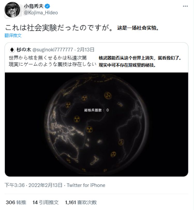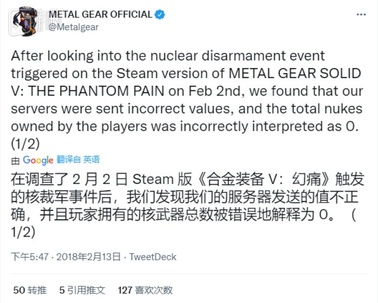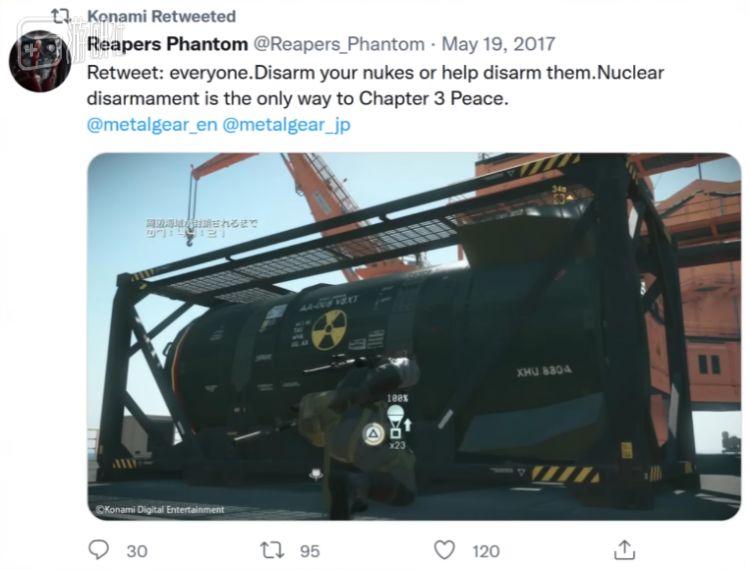 2017年5月19日,科乐美转发了一条推特,更是将暗示改成了明示。“转发:所有人。拆除你的核弹,或者帮助别人拆除核弹。无核结局是开启第三章《和平》的唯一方式。”